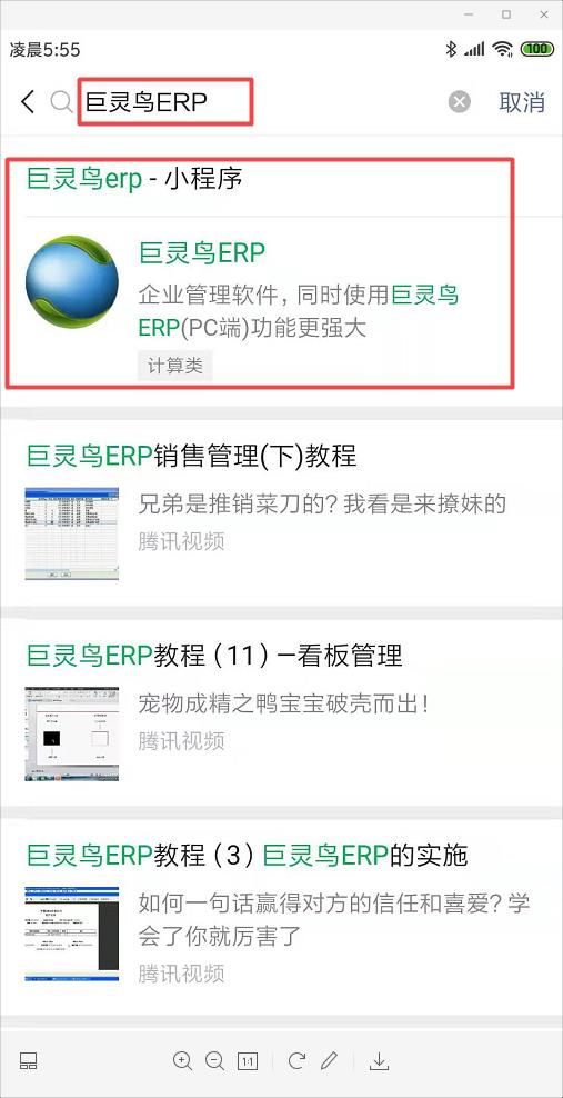 2、微信中搜索小程序:巨靈鳥ERP。