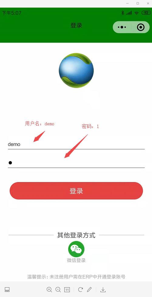 選擇微信小程序賬套,用戶名:demo,密碼:1