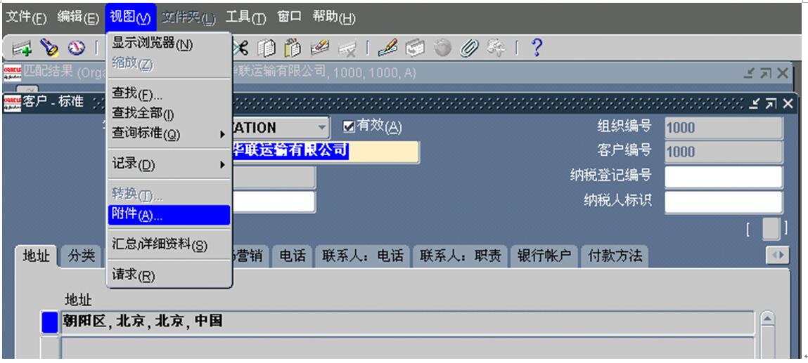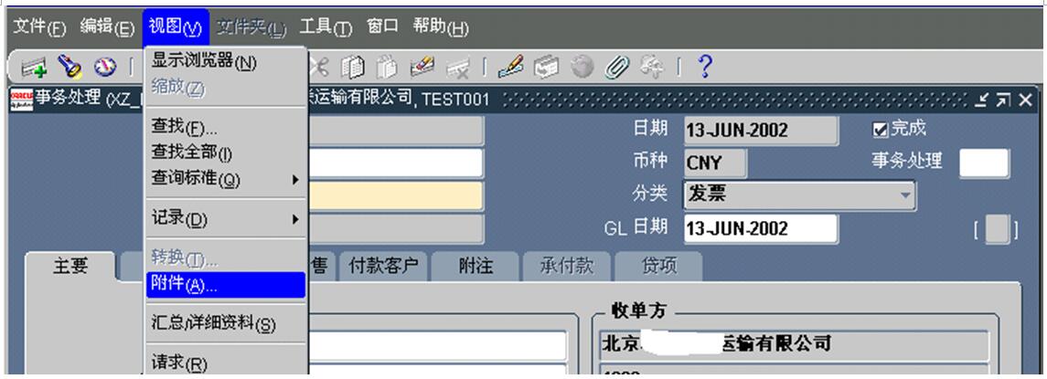 在將合同維護到系統中以后,在任何有權限并且需要了解合同信息的界面,比如錄入發票界面,與在維護合同時同樣的方法,通過附件菜單或曲別針工具按鈕: