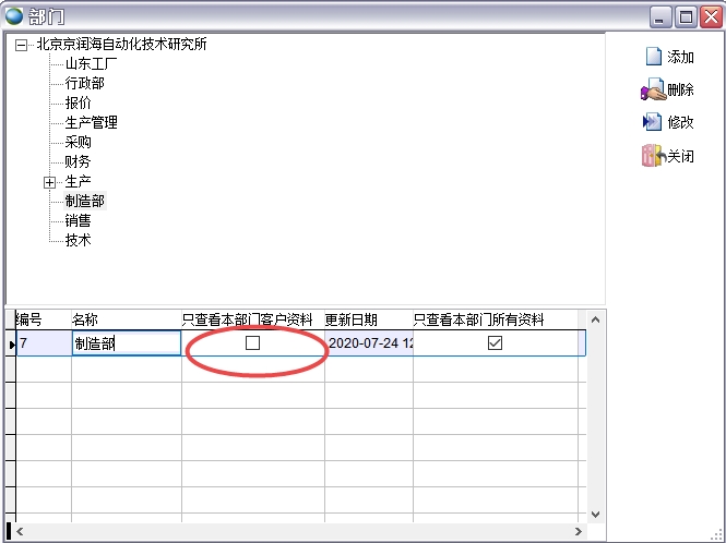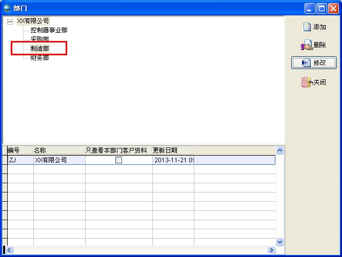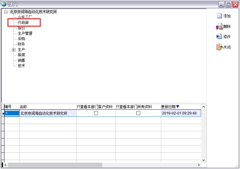 點擊需添加下級部門的部門名稱,如下圖在公司名稱下添加行政部: