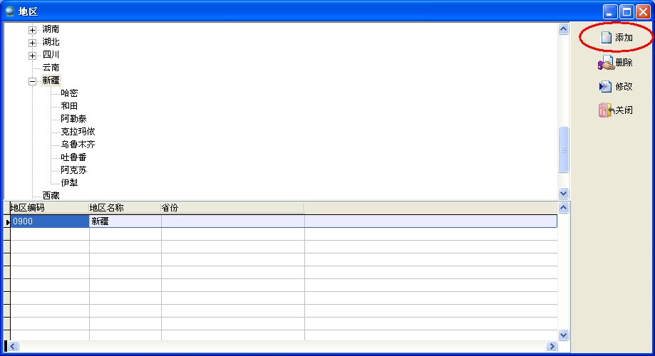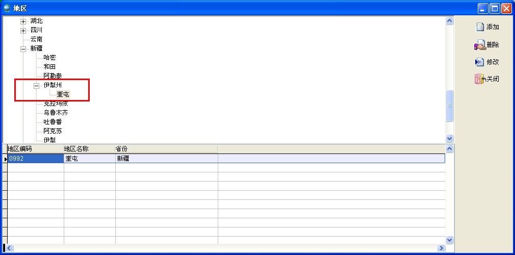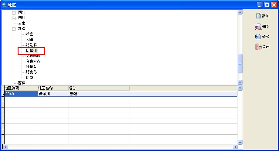 點擊需添加下級地區(qū)的地區(qū)名稱,如下圖要在新疆下面添加伊犁州,再在伊犁州下面添加奎屯市: