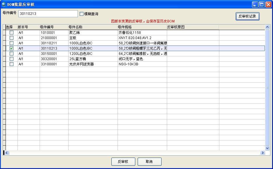可以一次性對多個BOM進行反審核,反審核時需說明反審核的原因。