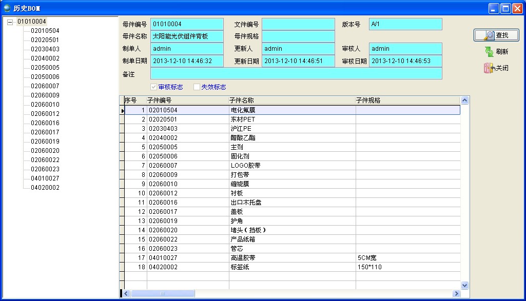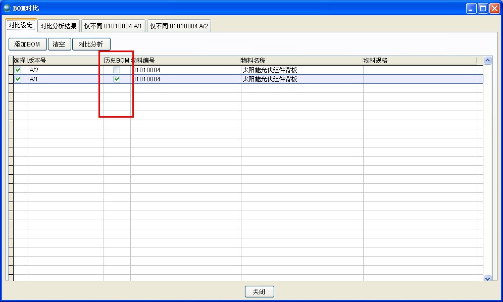 在BOM對比中也可以選擇現有BOM與歷史BOM進行內容的比對。詳見BOM對比