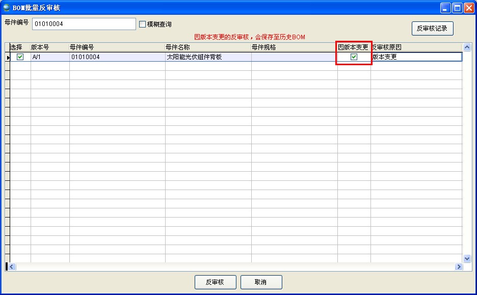 通過BOM批量反審核單據進行的反審核并且勾選了【因版本變更】的選項的反審核操作會被記錄到歷史BOM中。通過歷史BOM可以查看曾經審核使用過的BOM的內容。