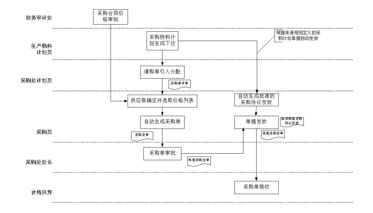 本章節主要描述采購業務流程的解決方案,它分為采購計劃與采購訂單兩部分。采購業務詳細流程圖: