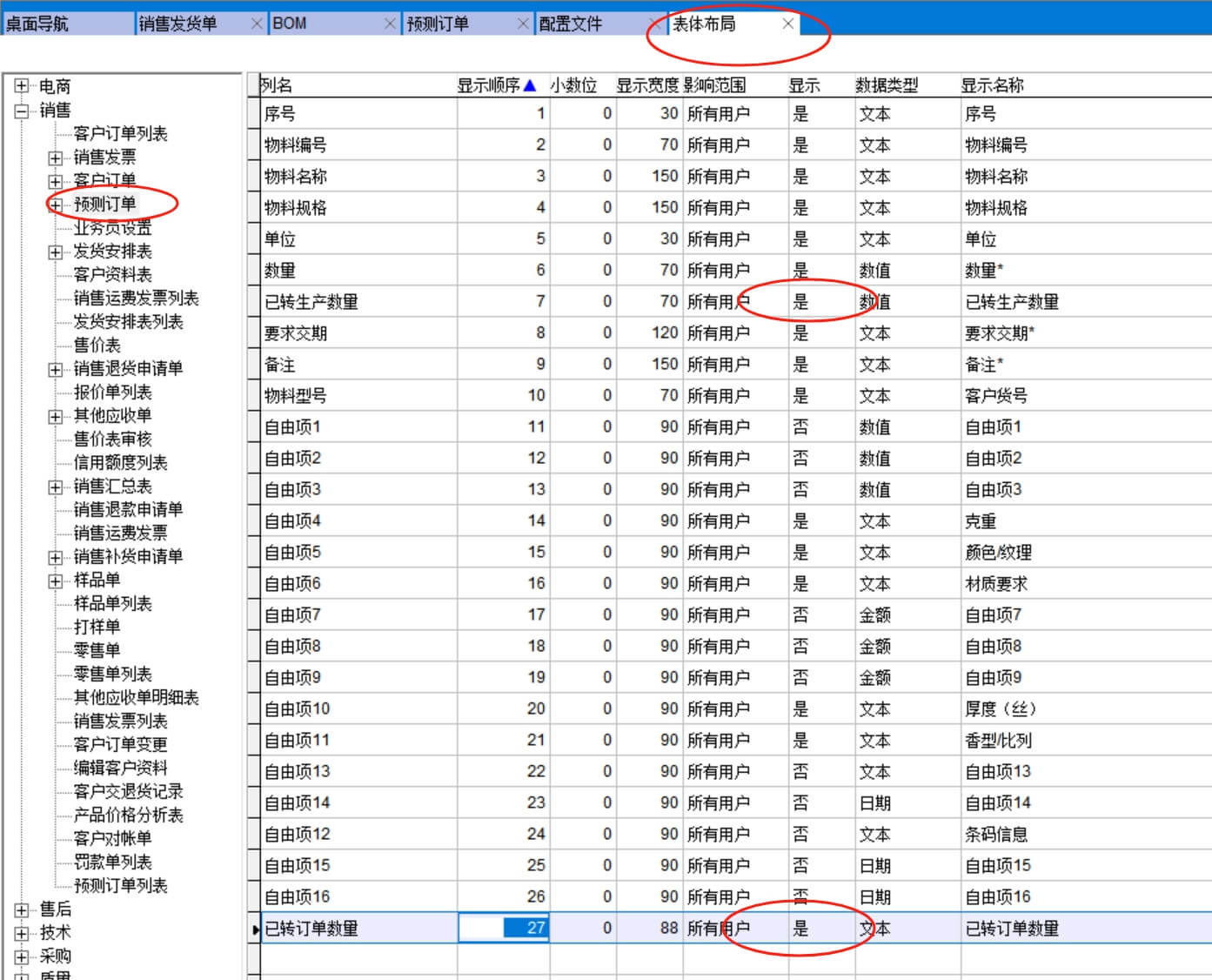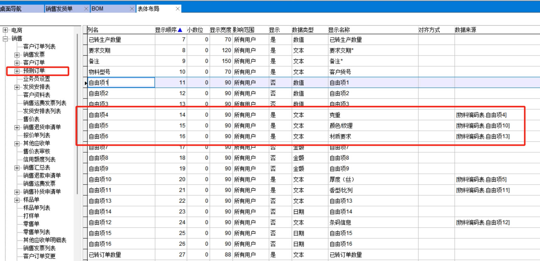 比如我們將自由項4改名為配置要求,表體布局中預測訂單和生產通知單都要設置