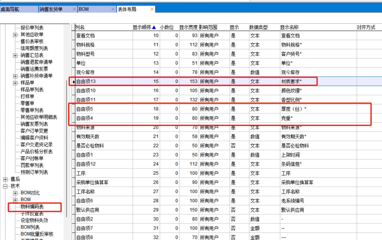 比如我們需要將物料編碼表中的自由項4、自由項5、自由項13引用到預測訂單中