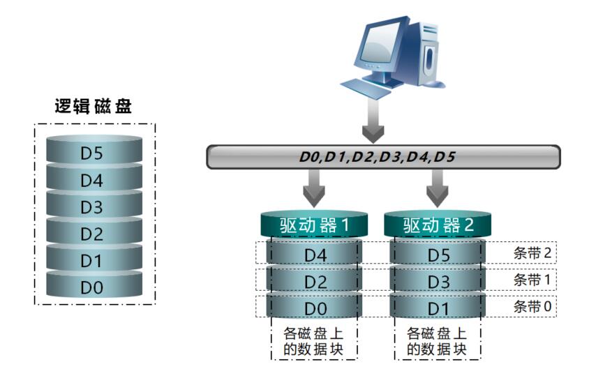 通過對硬盤上的數據進行條帶化,實現對數據成塊存取,減少硬盤的機械尋道時間,提高數據存取速度;