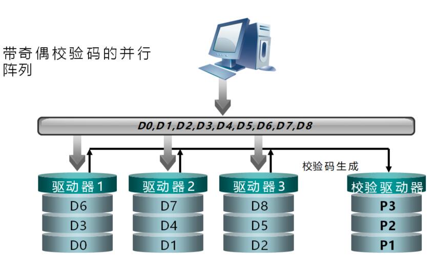 通過對一陣列中的幾塊硬盤同時讀取,減少硬盤的機械尋道時間,提高數據存取速度;