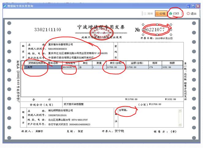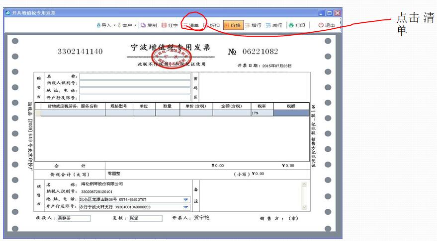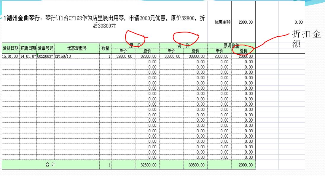 依次填入發(fā)貨日期,開票日期,發(fā)票號碼,優(yōu)惠琴型號以及原價和現(xiàn)價