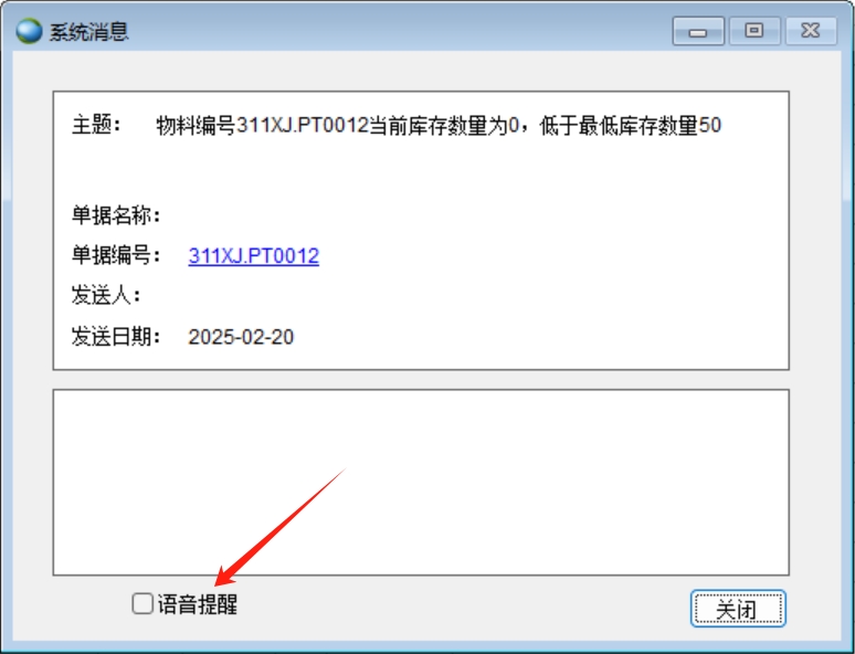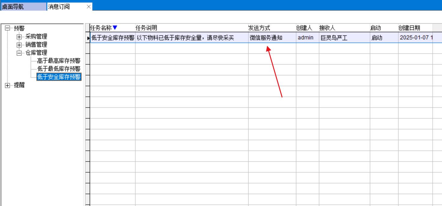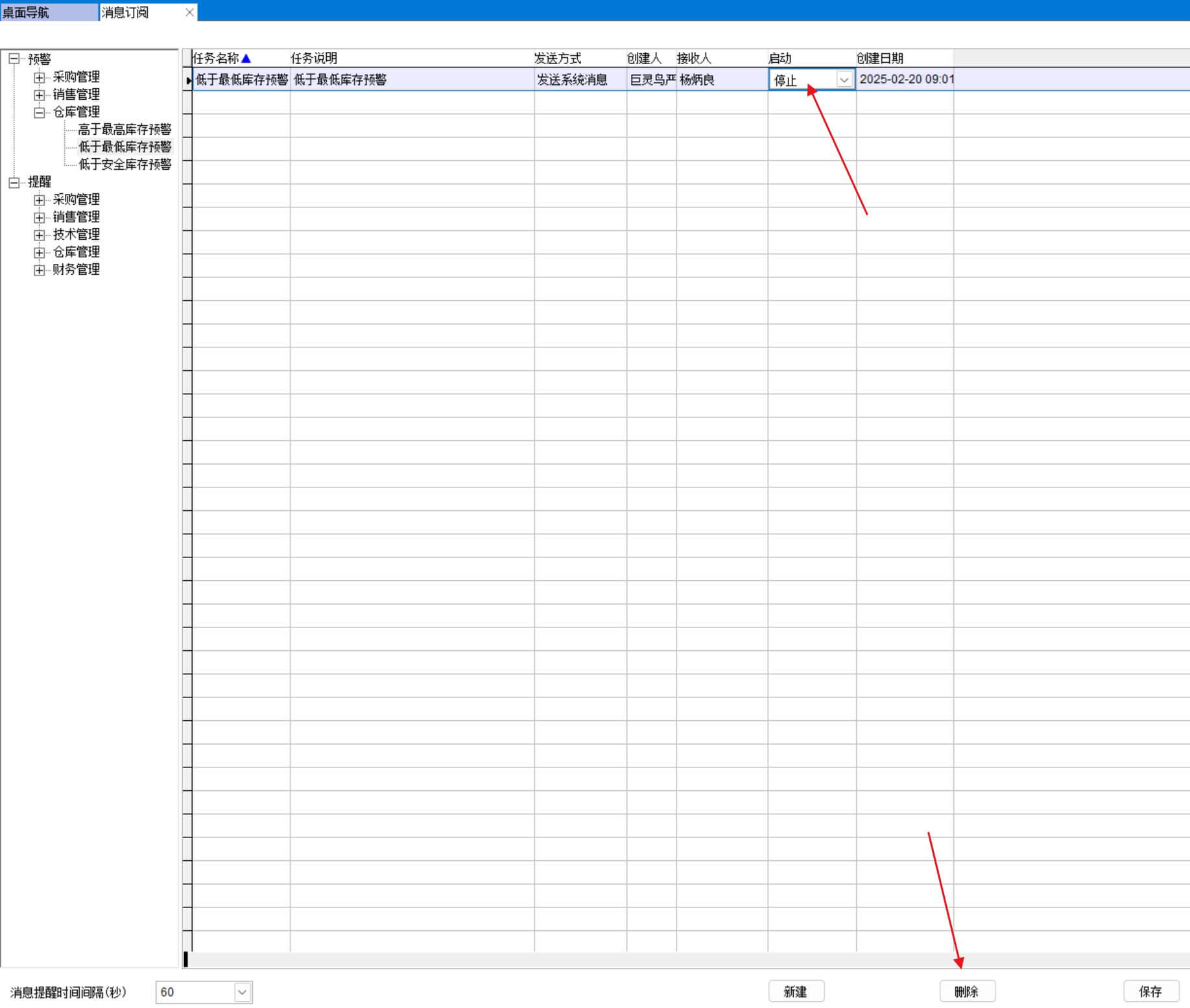 以倉庫的安全庫存預(yù)警為例,設(shè)置消息提醒的時間間隔問30秒,發(fā)送方式:發(fā)送系統(tǒng)消息
