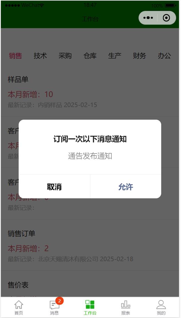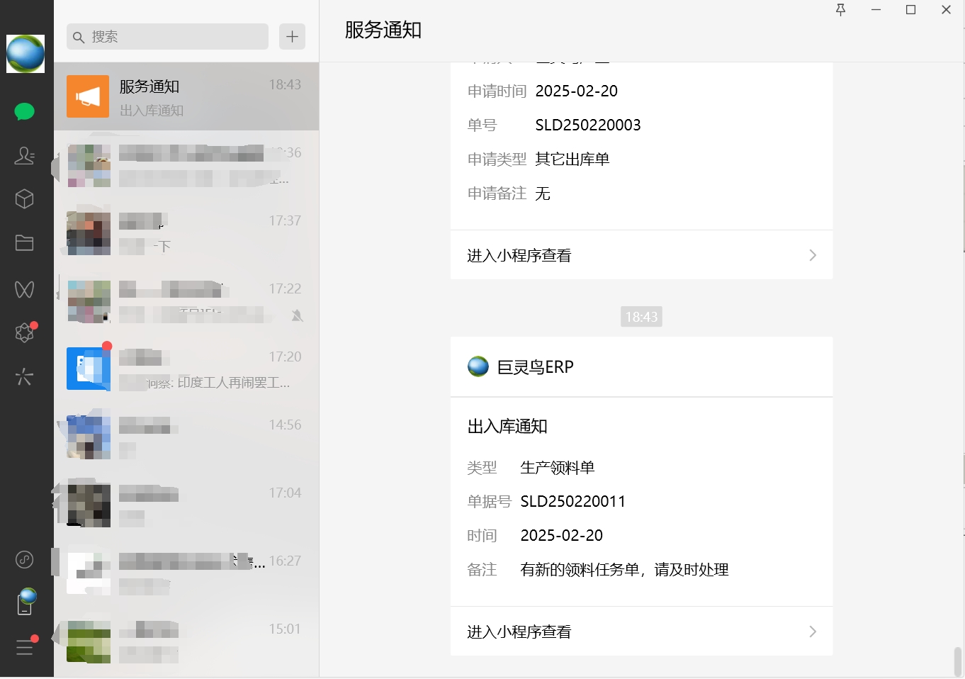 當(dāng)上述條件完成后,當(dāng)觸發(fā)訂閱的消息條件后,接收人就可以在微信中收到實時通知,比如我們訂閱一個消息:當(dāng)有新的領(lǐng)料單產(chǎn)生時,提醒倉管員及時處理