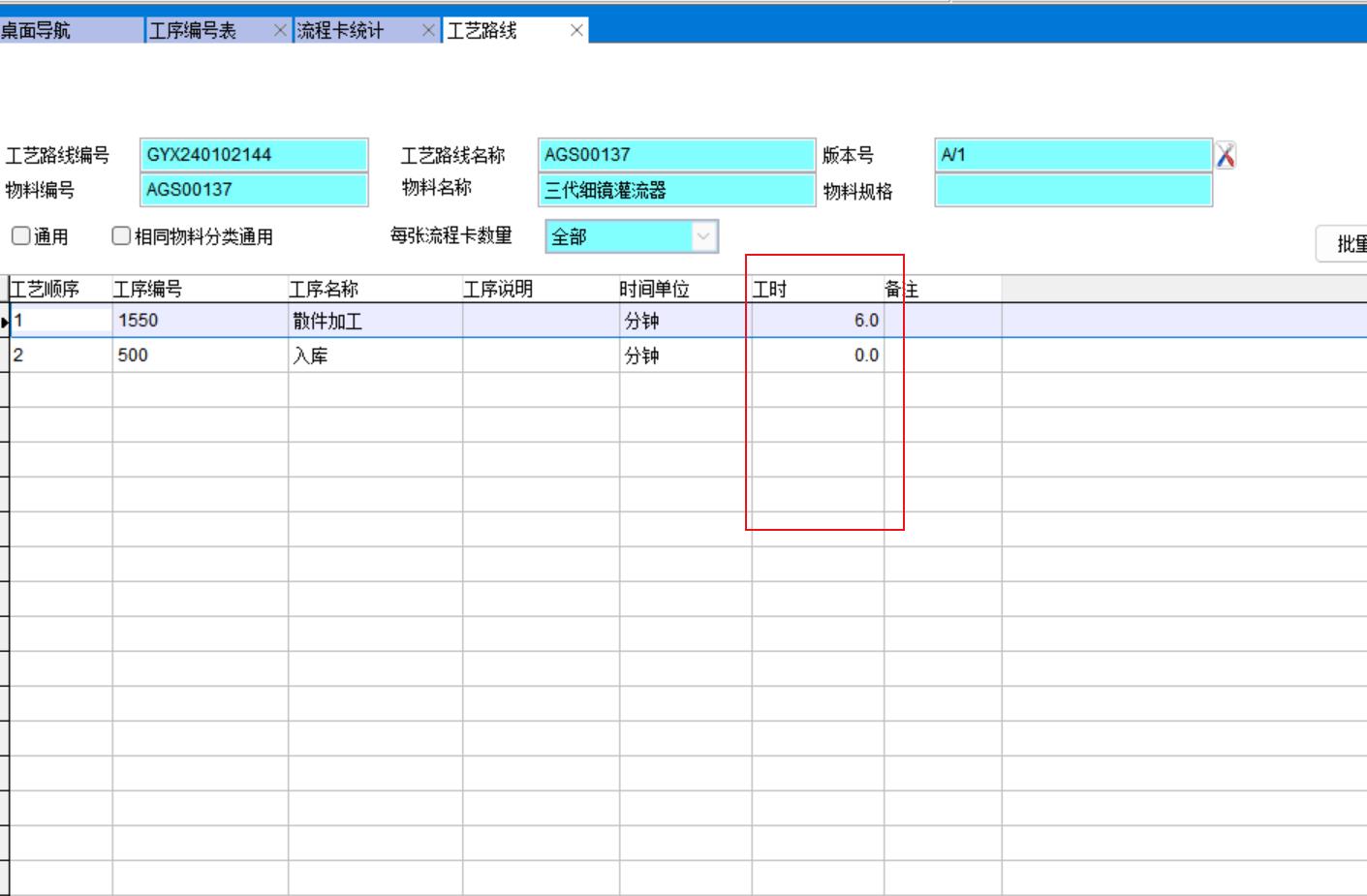 可以在工序編號(hào)表中輸入標(biāo)準(zhǔn)作業(yè)時(shí)間,也可以在工藝路線中輸入,在工序編號(hào)表中輸入會(huì)影響所有工藝路線,即這個(gè)標(biāo)準(zhǔn)工時(shí)對(duì)所有產(chǎn)品都一樣。