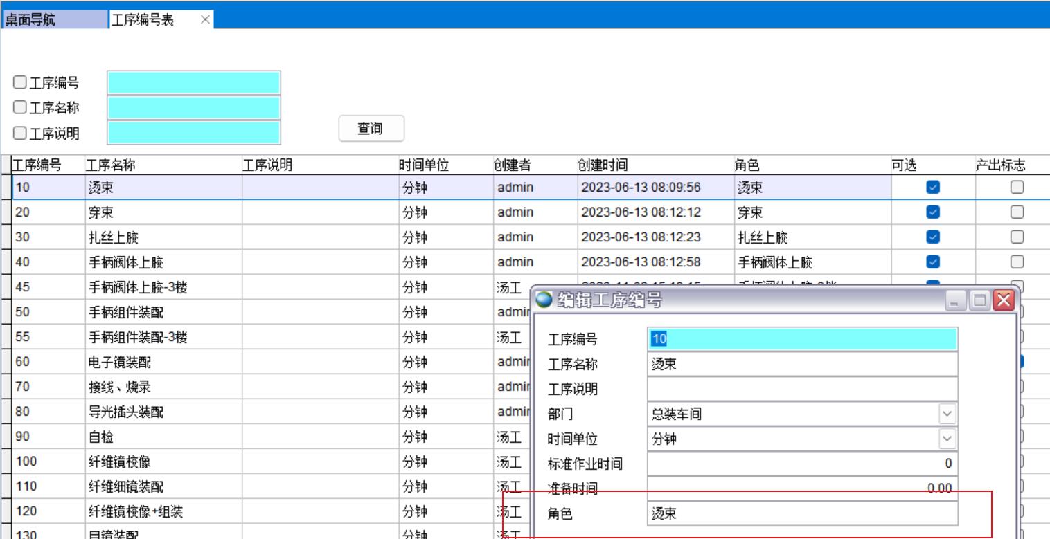 比如張三、李四負(fù)責(zé)燙束工序,王五負(fù)責(zé)穿束工序,設(shè)置兩個(gè)角色燙束、穿束,分別綁定這兩個(gè)工序