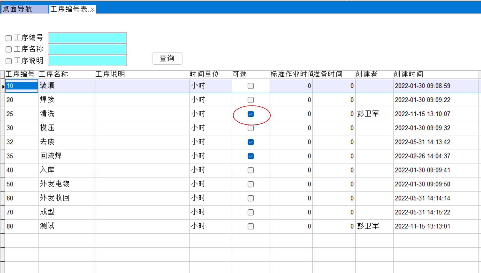 比如清洗工序是后加的,是在焊接之后的工序,就編號(hào)為25,保存后自動(dòng)排到焊接后面。系統(tǒng)是按工序編號(hào)進(jìn)行排序的,所以工序順序必須按數(shù)字大小進(jìn)行編號(hào),否則后面使用過程中會(huì)出現(xiàn)問題。