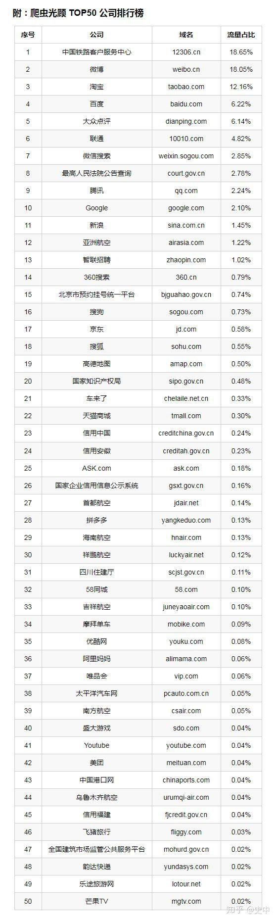 除了剛才這些小模塊,企業(yè)還可以通過 WAF(Web 應(yīng)用防火墻)來防護(hù),WAF 的功能就是通過設(shè)置一些規(guī)則,攔截掉那些不符合規(guī)則的請(qǐng)求。但是,爬蟲的請(qǐng)求,和真人的請(qǐng)求真的太像了。我覺得,對(duì)這種戰(zhàn)爭(zhēng)一個(gè)形象的比喻就是抗癌。癌細(xì)胞的目的就是拼命躲過免疫細(xì)胞的識(shí)別,而免疫細(xì)胞的目標(biāo)就是拼命分辨哪個(gè)是好細(xì)胞哪個(gè)是癌細(xì)胞。在我看來,這場(chǎng)對(duì)抗爬蟲的常規(guī)戰(zhàn)眼看就要升級(jí)為“智能戰(zhàn)”,而且戰(zhàn)線會(huì)向云端轉(zhuǎn)移。比如騰訊云的 WAF,聽說最近就要通過人工智能的方法來識(shí)別爬蟲。這里就不幫他們打廣告了。還有很多其他的云安全廠商,也開始主推反爬蟲的技術(shù)。不過,就像人類目前難以消滅癌癥一樣,企業(yè)也難以完全消滅爬蟲。但是我相信,在對(duì)抗中這條戰(zhàn)線會(huì)達(dá)到一個(gè)精妙的平衡。這個(gè)戰(zhàn)線每向前推進(jìn)一步,都需要安全研究員付出艱辛的努力。三、《中國焦慮圖鑒》最后,中哥幫你搞到了一張秘密表格。這是被監(jiān)測(cè)到的受爬蟲侵?jǐn)_最多的 Top50。(采樣數(shù)據(jù),僅供參考)