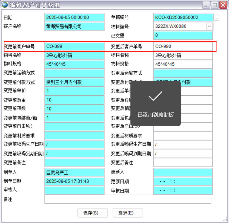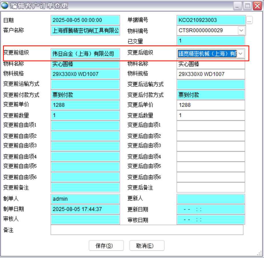 客戶單號變更和組織變更默認是隱藏的,需要通過表單布局先顯示出來