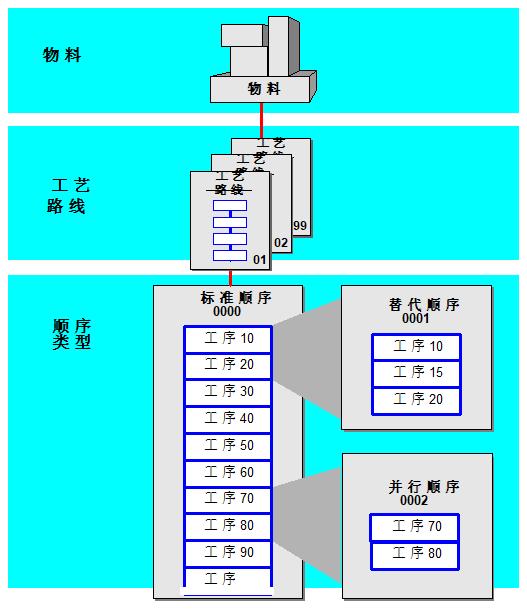 在工藝路線中順序組合了多個相連接的工序。順序中的工序被依次進行處理。順序通過前驅和后繼的關系來闡明復雜的生產過程。在SAP系統中有三種順序類型: