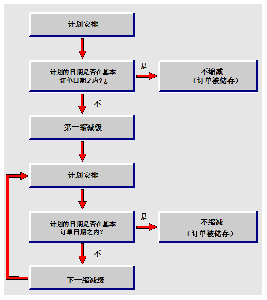 如果計劃中算出的提前時間大于基本日期之間的時間,系統(tǒng)將執(zhí)行縮減措施來減少提前時間。