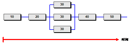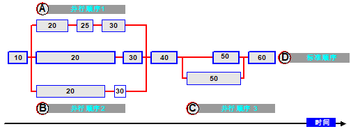 標準順序和每個并行的順序被分配一個對準碼。下圖顯示對準碼同如何安排這些順序之間的關系。圖中的緩沖時間被畫上陰影線。這里三個并行的順序被利用最早的可能日期對準,標準順序被利用最遲的可能日期對準。