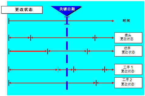 如果你用一個更改號更改工藝路線或工藝路線對象,則工藝路線有幾個更改狀態(tài)。如果你從未用更改號進行更改,則工藝路線和它的對象只有一個更改狀態(tài)。
