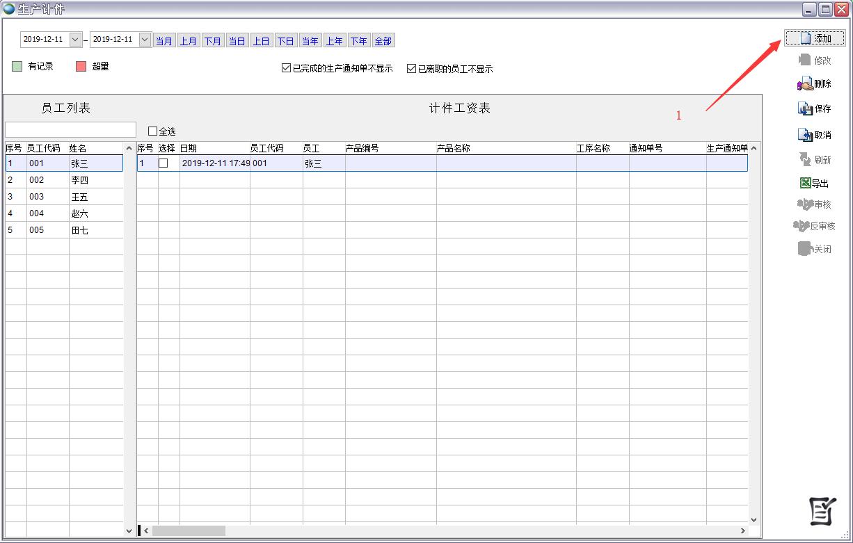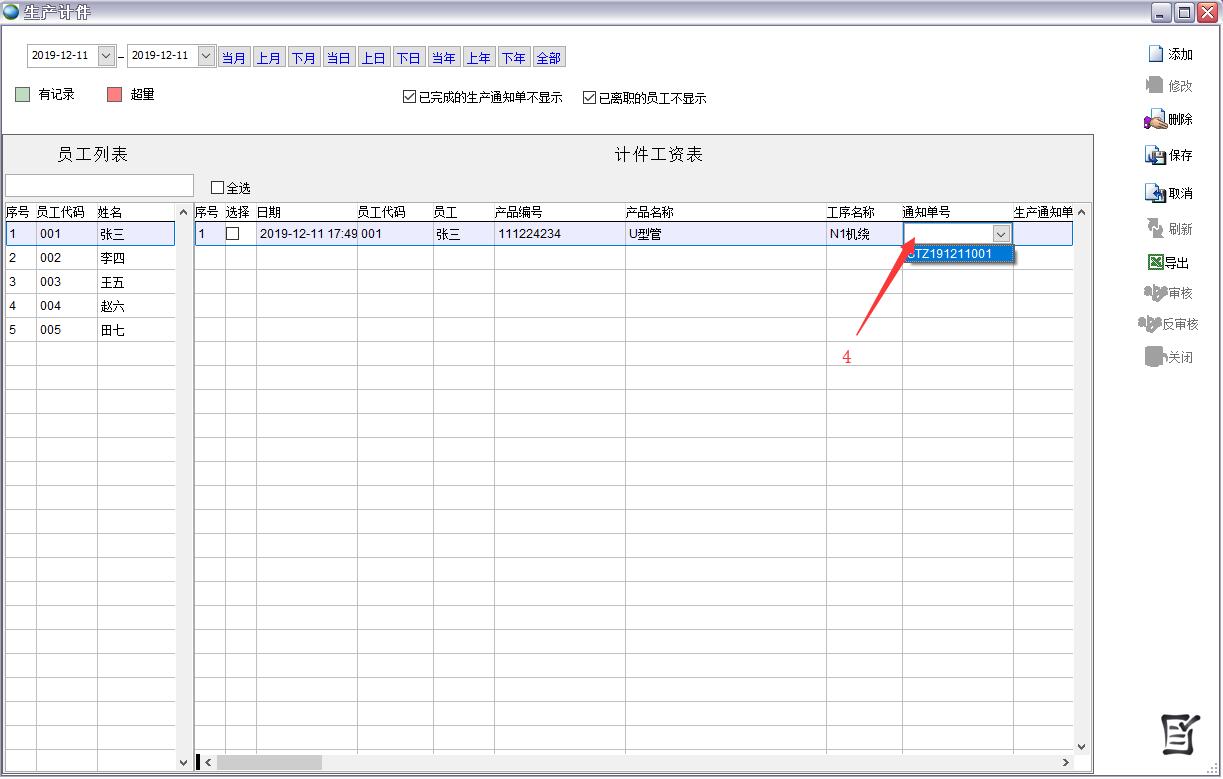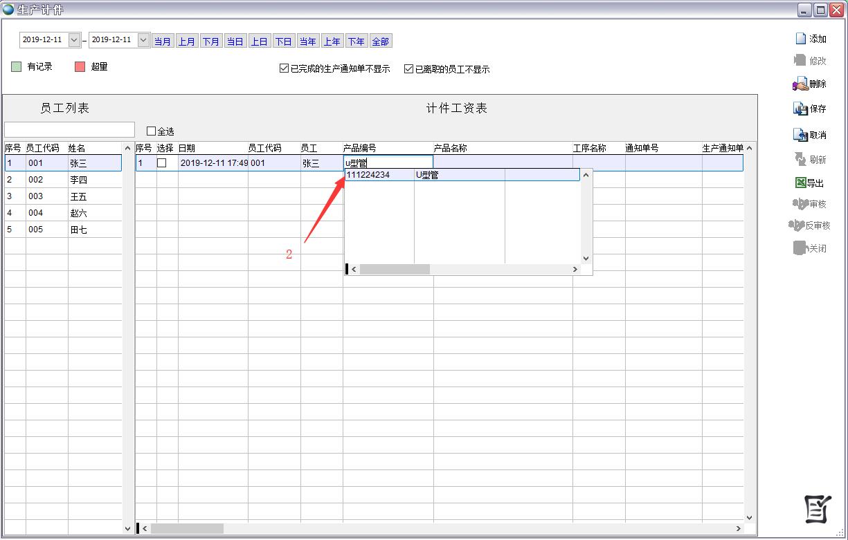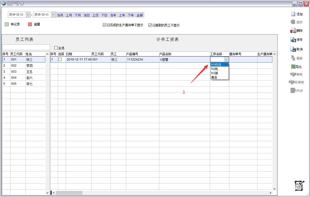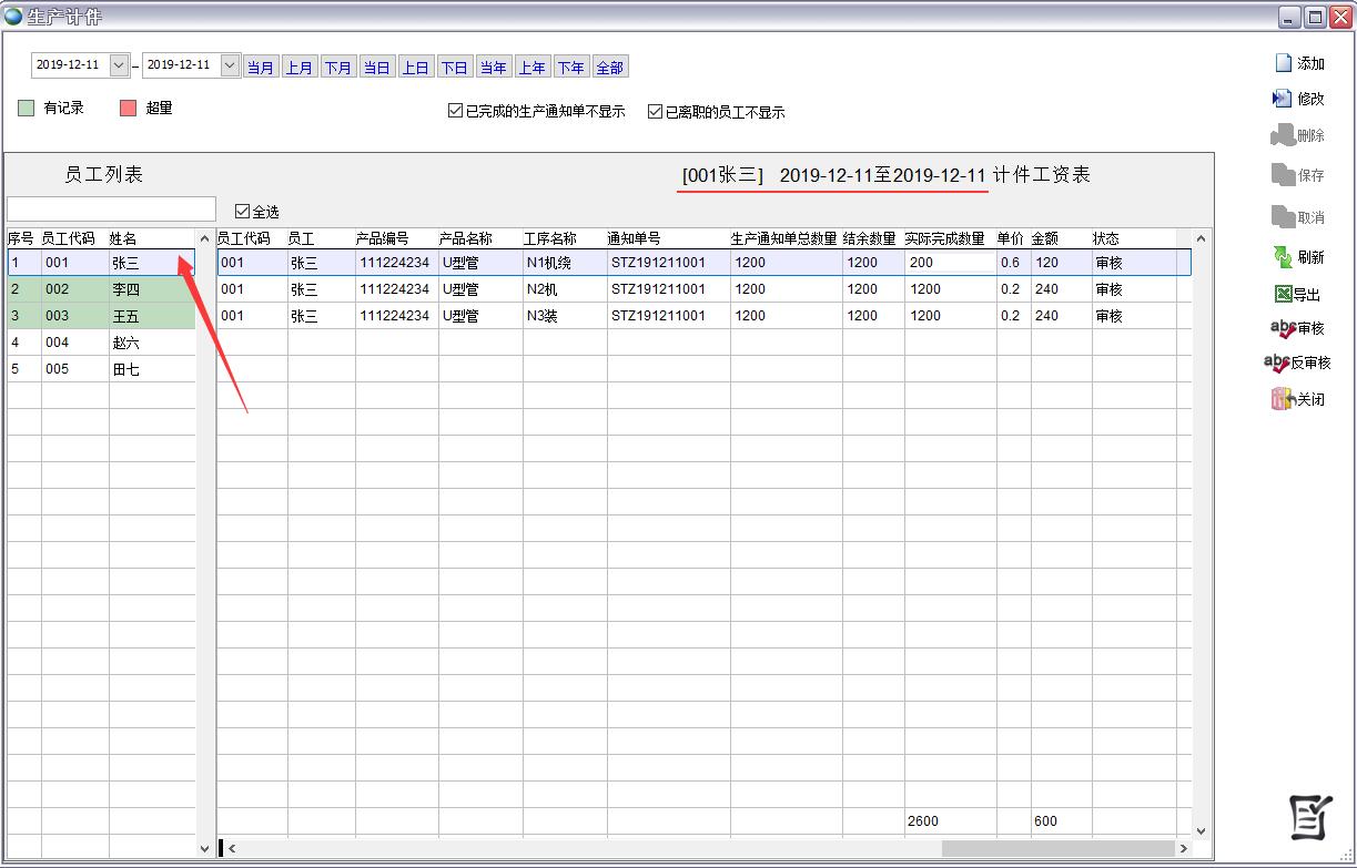 點擊右側的員工,可以只顯示該員工的生產計件記錄