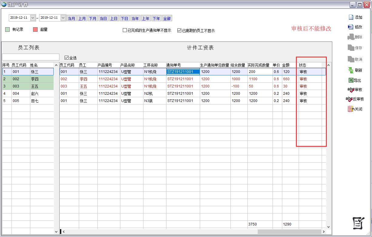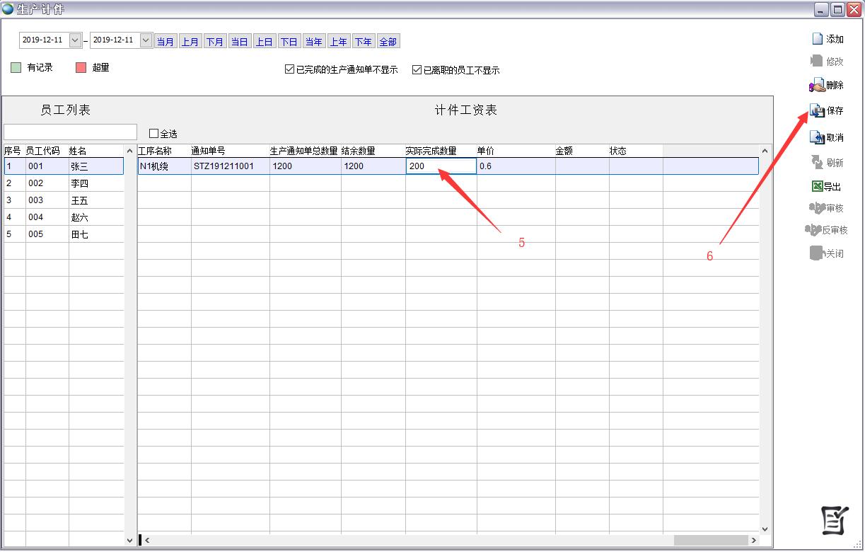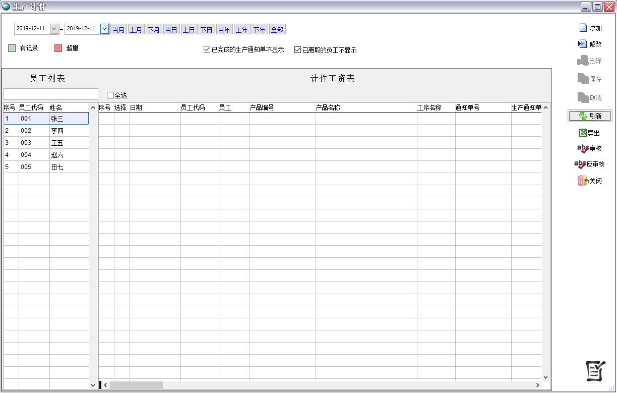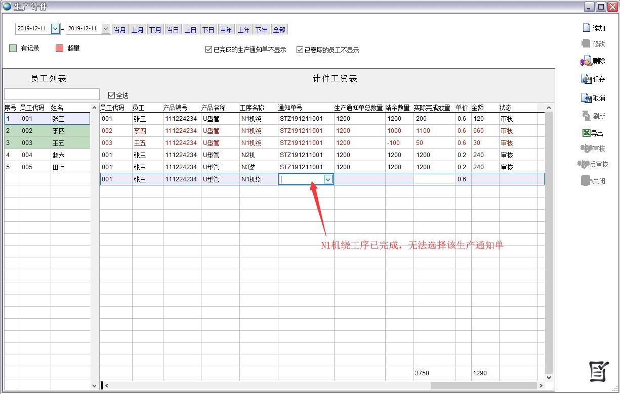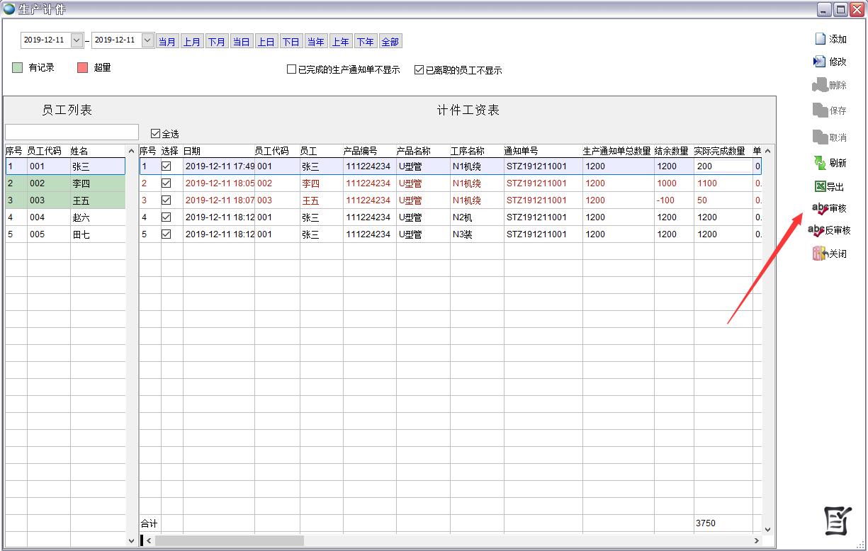點擊右側的員工,可以只顯示該員工的生產計件記錄