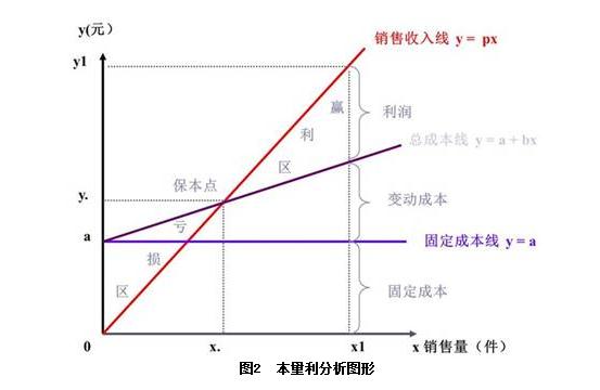 從圖2中可以看出,由于租金、折舊費等固定成本在一定的業(yè)務(wù)量前提下固定不變,因此固定成本是一條水平線。淺藍色線為變動成本線,隨著業(yè)務(wù)量的增長,變動成本越來越大。變動成本加上固定成本就叫做總成本,圖中藍色線即為總成本線,紅色線代表企業(yè)的銷售額,銷售額隨著銷量的增加而上升,在上升過程中與成本線有一個交叉點,這個交叉點就是保本點。