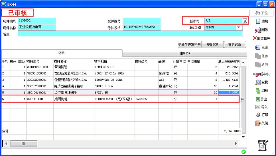 生產過程中技術部門需要變更BOM如下圖需要增加1個威圖機柜的,可以通過BOM變更通知單完成變更流程,無需刪除任何已有單據,變更完成后相應單據會自動發生變化。