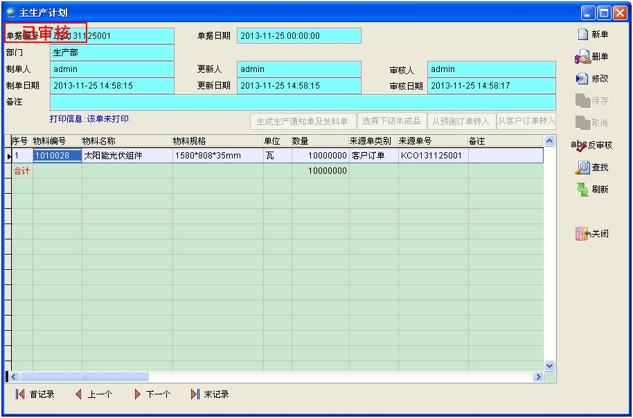 雙擊計劃單號,可以打開其對應的主生產計劃單。