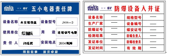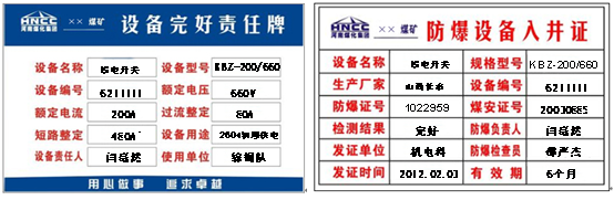 (二)背面防爆入井證防爆證號、煤安證號,應與設備銘牌上一致,防爆證上防爆檢查人應是機電科有資質防爆檢查員簽名,防爆負責人是單位包機人。