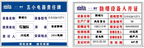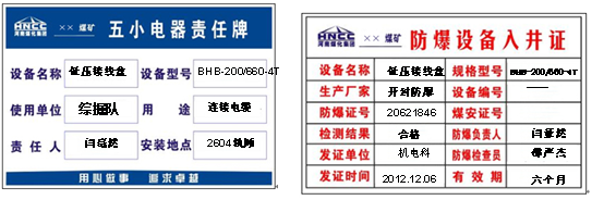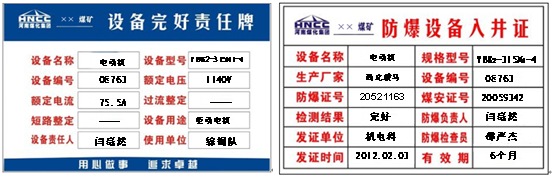 (二)背面防爆入井證防爆證號、煤安證號,應與設備銘牌上一致,設備編號填寫礦統一編號,防爆證上防爆檢查人應是機電科有資質防爆檢查員簽名,防爆負責人是單位包機人。