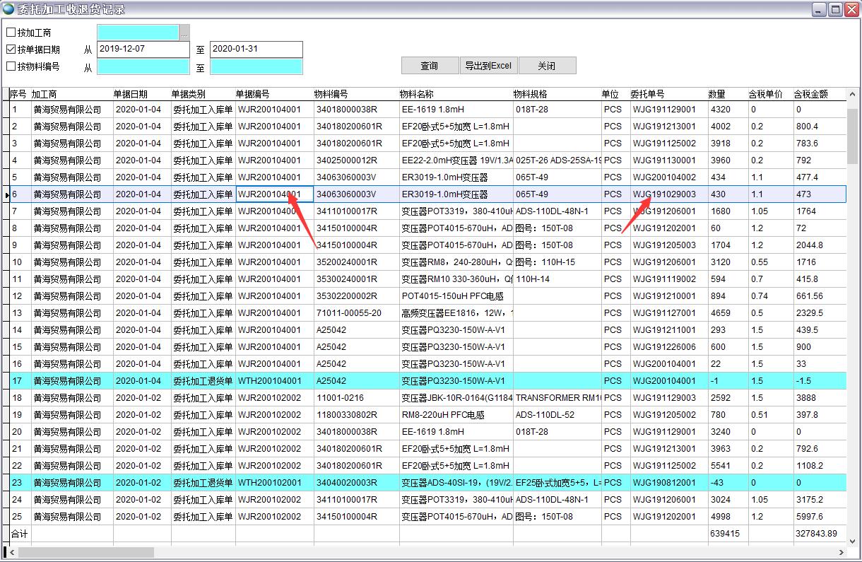 雙擊單據(jù)編號(hào)可以查看委托加工入庫(kù)單或委托加工退貨單明細(xì),雙擊委托單號(hào)可以查看委托加工單明細(xì)