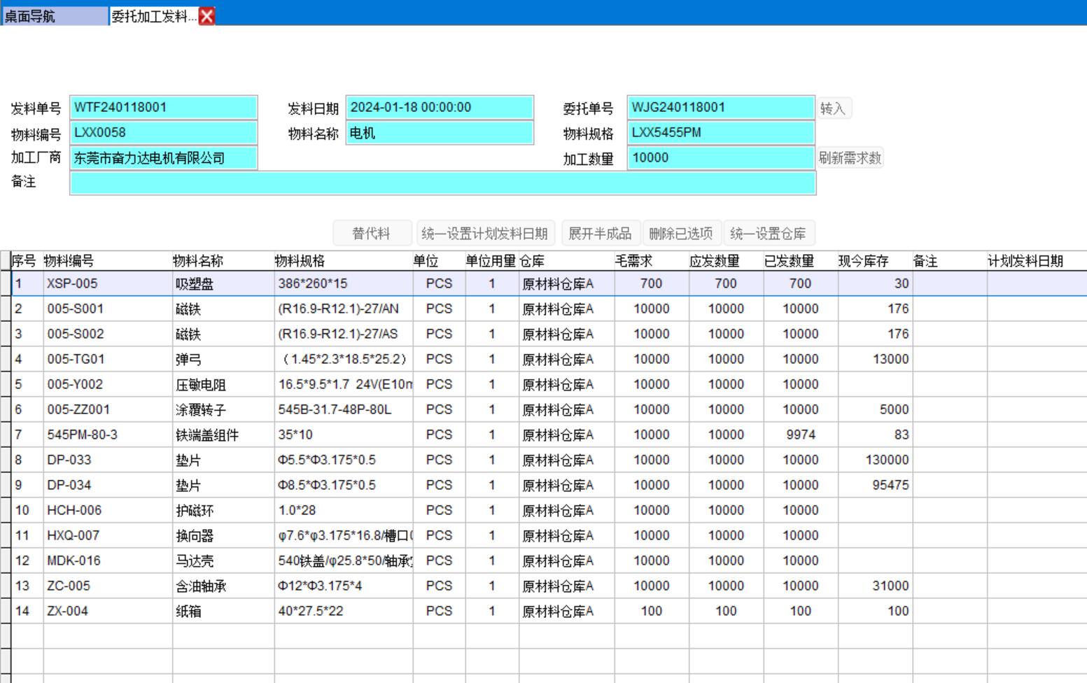 委托加工發料單會根據BOM展開所有材料