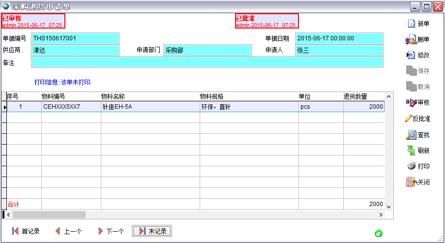 采購退貨申請單為手工新增,錄入供應商及物料所對應的編碼生成單據。采購退貨申請單的相關信息會關聯到供應商交退貨記錄表中。