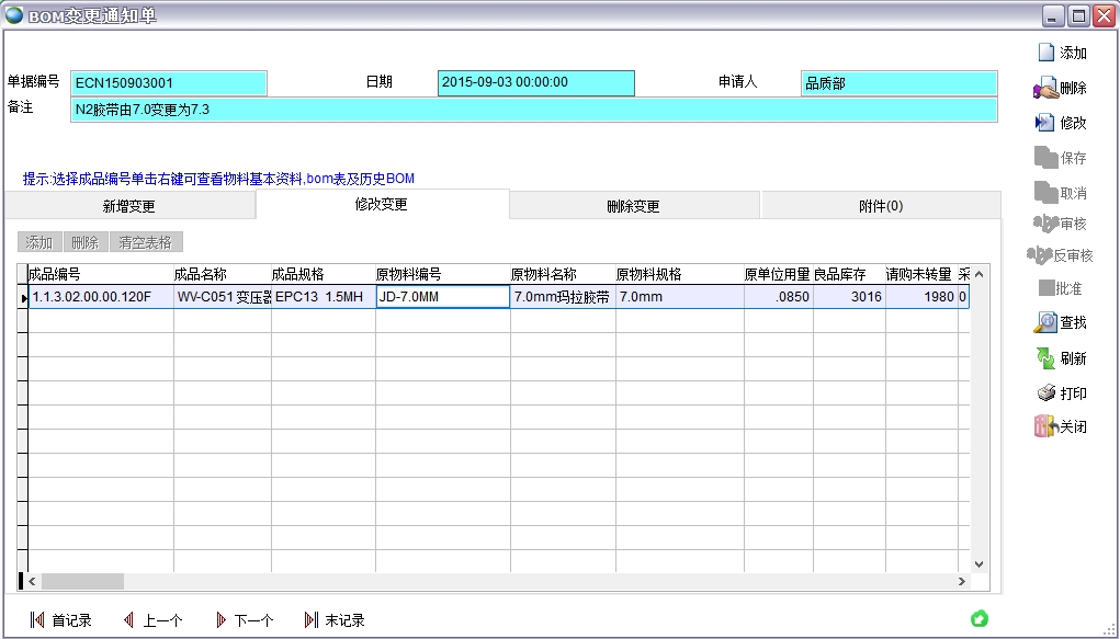 1、BOM變更分新增變更、修改變更、刪除變更。