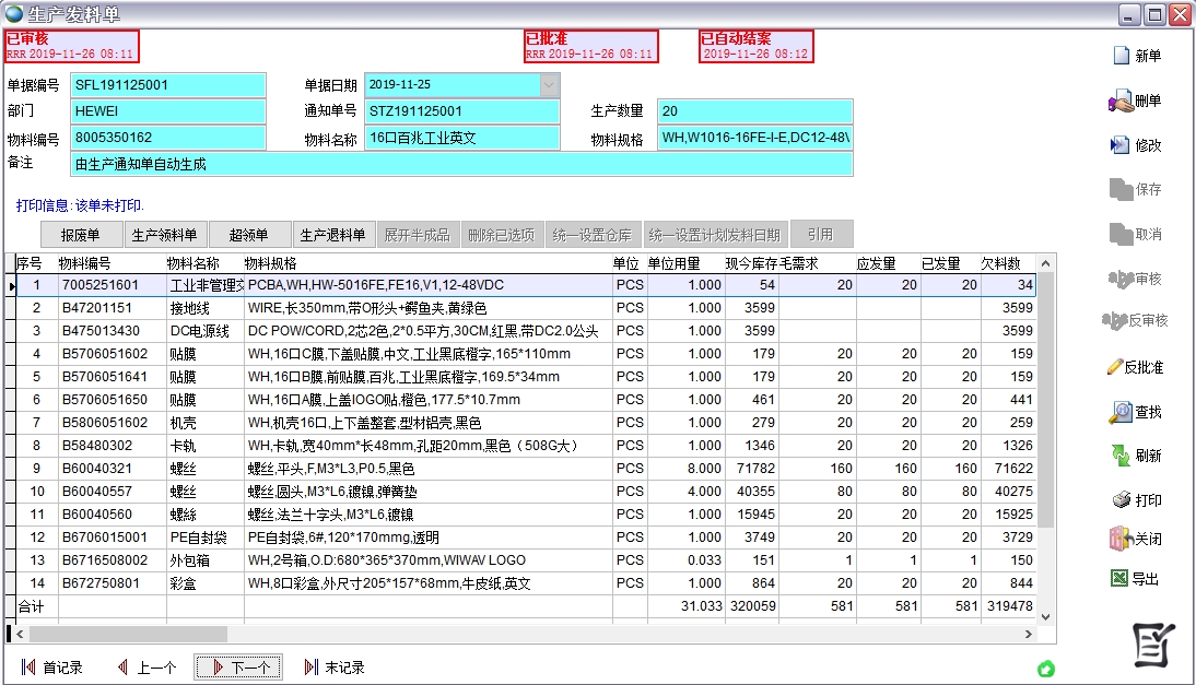 1、根據MRP自動計算材料需求,從根本上杜絕了缺料少件的情況。