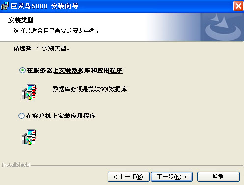 巨靈鳥5000的安裝分服務端安裝和客戶端安裝兩部分,如果是單機使用只需選擇第一個安裝選項“在服務器上安裝數據庫和應用程序”。如果是聯機使用,首先安裝服務端,選擇第一個安裝選項“在服務器上安裝數據庫和應用程序”,然后所有客戶端選擇第二個安裝選項“在客戶機上安裝應用程序”。