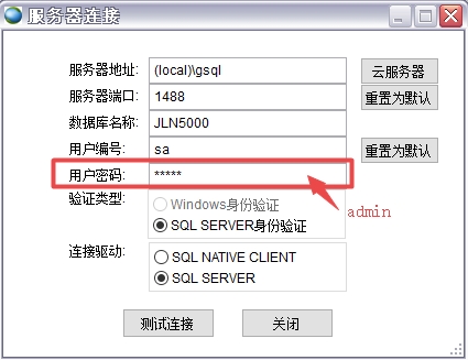 首次登錄需要連接服務器,如果使用的是GSQL數據庫軟件,默認的用戶編號:sa,用戶密碼:admin