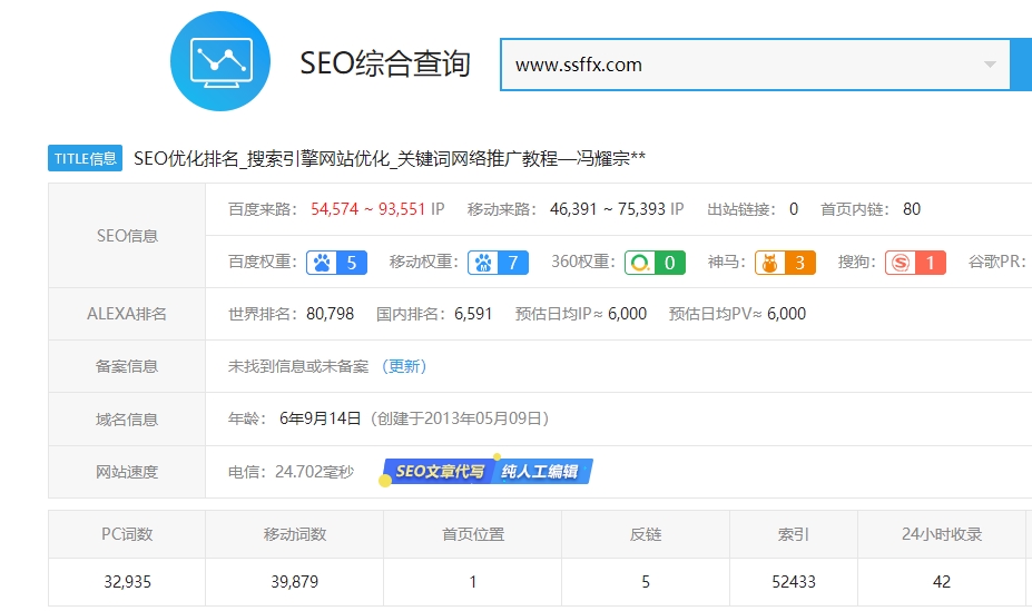 先給大家看一個案例,www.ssffx.com,這個網站名稱叫馮耀宗博客,用站長工具分析這個網站的權重和流量都很高,百度收錄是7萬,百度權重5,百度預估流量6萬。
