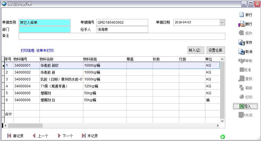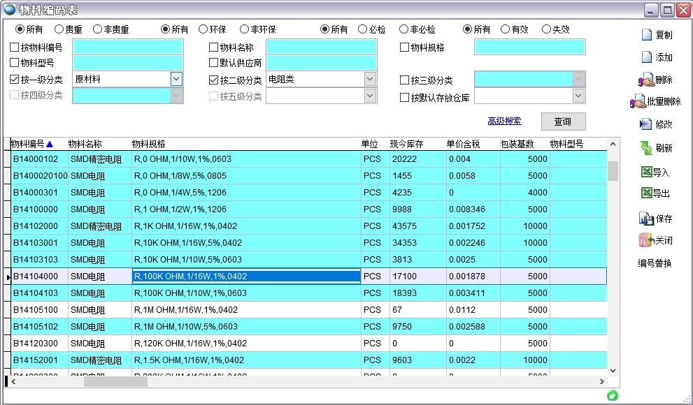 物料編碼表,即物料檔案信息,支持導入導出、打印等功能。