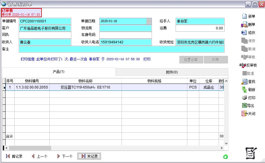出庫單,包括銷售發貨單、生產領料單、其他入庫單、原材料退貨單、委托加工領料單,支持掃碼出庫功能。