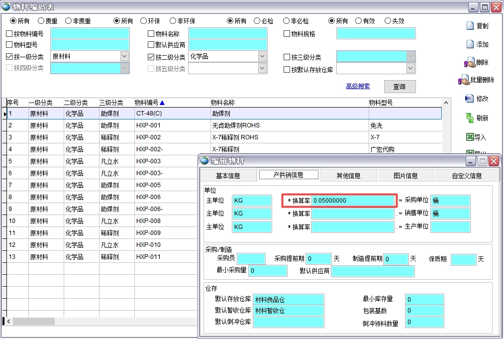 有些企業全部使用掃碼進行出入庫操作,這就存在條碼的計量單位與物料主計量單位之間的換算。這時需要ERP系統自動計算換算率和單位轉換。以下舉例以膠水為例,供應商送貨膠水每桶25公斤(采用浮動換算率,即下次送貨有可能每桶不是25公斤)