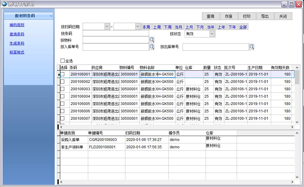 2、生成條碼,條碼數量手工填寫,生成條碼后每個條碼(條碼單位是桶)對應的公斤數就確認了,如下圖200公斤8個條碼,即每桶=25公斤
