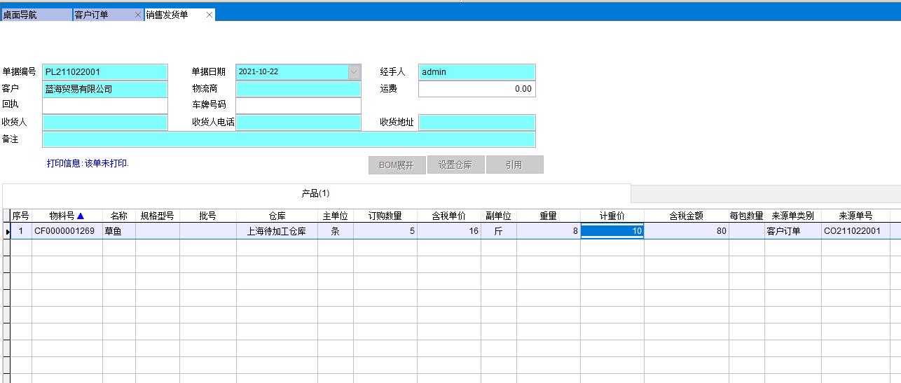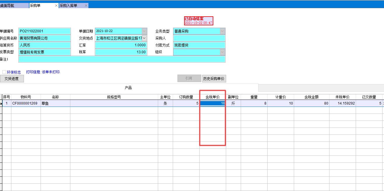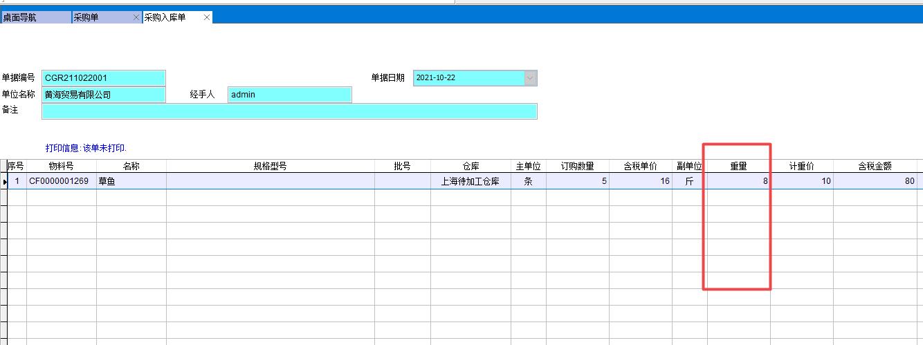 做采購入庫單時填寫重量8斤,此時金額會自動計算得出8斤*10元=80元