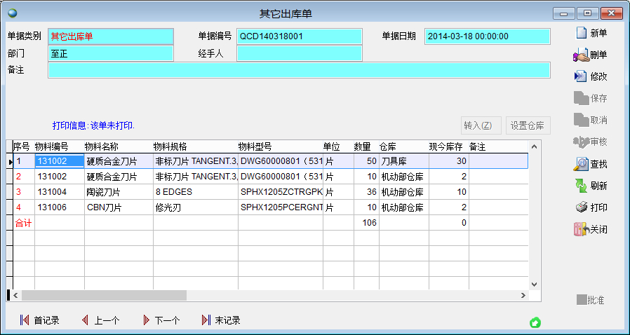 其它出庫單是指銷售出庫、生產領料出庫之外的其它出庫業務,如調撥出庫、盤虧出庫、形態轉換出庫等業務形成的出庫單。其它出庫單一般手工填制。