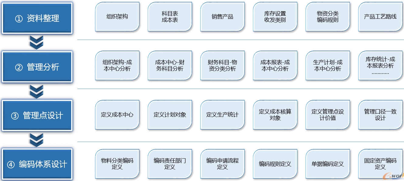 •第四級:工序級核算,產品核算到工序加工過程,各生產單元的費用匯總到生產工序,進行分攤。該級核算對統計要求非常高,每工序完工必須可計量。