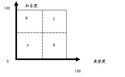 上面這個圖,縱坐標(biāo)代表知名度,橫坐標(biāo)代表美譽度,分值從0到100,分成了四個區(qū)域。