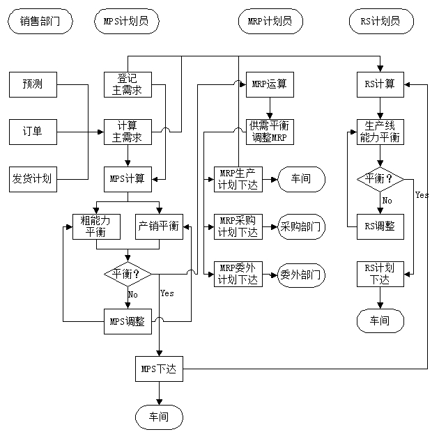 產銷平衡:目標是保證現有庫存、預計產出、計劃產出在未來的各時間段都能滿足銷售需要。MPS運算是按需排產,運算結果一定滿足產出與銷售的平衡,但由于企業生產能力的限制,可能會出現總體能力的不足,或某階段能力的不足,為了解決這一問題,如前所述,必須進行粗能力平衡,不平衡時調整計劃,調整后的計劃再經過產銷平衡檢查,當平衡結果出現問題時,可能進一步調整計劃。粗能力平衡與產銷平衡有時是不相容的,MPS計劃員需要綜合判斷,以達到整體的平衡。