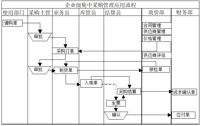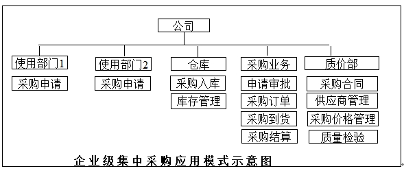 企業級集中采購管理模式指在企業級采購管理應用中,各部門所需物料統一由采購部門進行集中采購,尤其對公用的物料采購,如辦公用品、辦公設備、消耗性材料、勞務,及重要物料,可以由各用料部門提出采購申請,由專門的采購部門進行采購,另外基于“不相容權利應分開設置”的原則,將定價權、采購權、質檢權及支付權做必要的分離,如對供應商選擇、采購價格、質量檢驗、采購合同簽定等可設置專門的質價部進行管理。